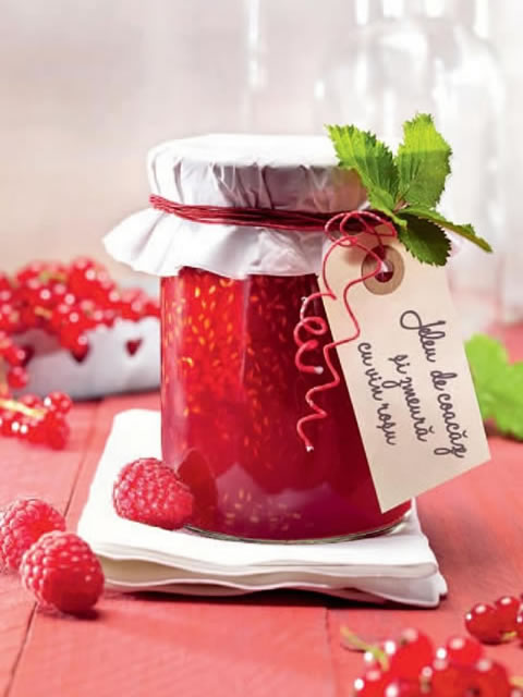 Sucul şi zmeura se pun într-o oală şi se amestecă bine cu Gelifiant cu fructoză. Compoziţia se amestecă continuu la foc moderat şi se aduce la fierbere. Se continuă fierberea în clocot pentru 3-5 minute. Se adaugă vinul roşu. Se înlătură spuma şi imediat se umplu până la margine borcanele pregătite în prealabil. Se închid cu capace cu filet, se răstoarnă şi se lasă să stea sprijinite pe capac circa 5 minute pentru o mai bună omogenizare.