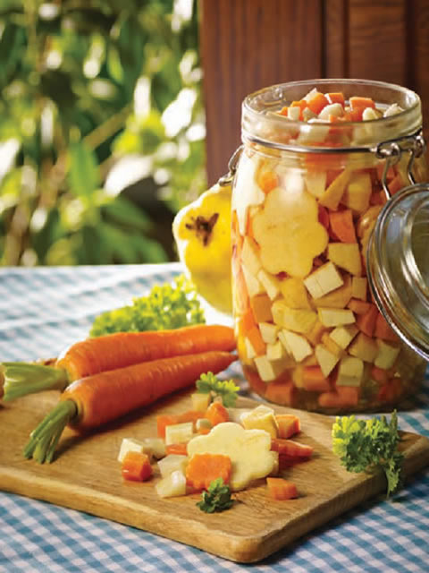 Păstârnacul, pătrunjelul şi morcovii se spală şi se curăţă. Gutuile se spală şi se taie în două, după care se scot miezul lemnos şi sâmburii. Toate legumele şi gutuile se taie cubuleţe, se amestecă şi se pun în borcane.