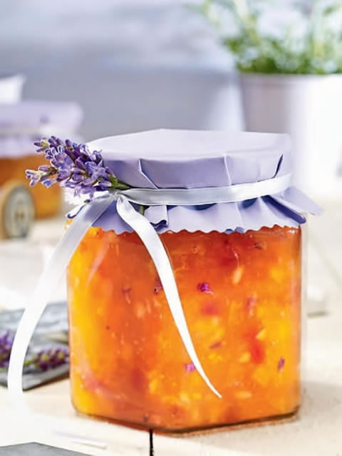 Piersicile, sucul de lămâie şi florile de lavandă se pun într-o oală mare. Se amestecă Gelfix Clasic 1:1 cu 2 linguri de zahăr, după care se adaugă peste masa de fructe şi se amestecă. Se amestecă continuu la foc moderat, se adaugă restul de zahăr şi se aduce la fierbere. Se continuă fierberea în clocot pentru 3 minute. Se înlătură spuma şi imediat se umplu până la margine borcanele pregătite în prealabil. Se închid cu capace cu filet, se răstoarnă şi se lasă să stea sprijinite pe capac circa 5 minute.